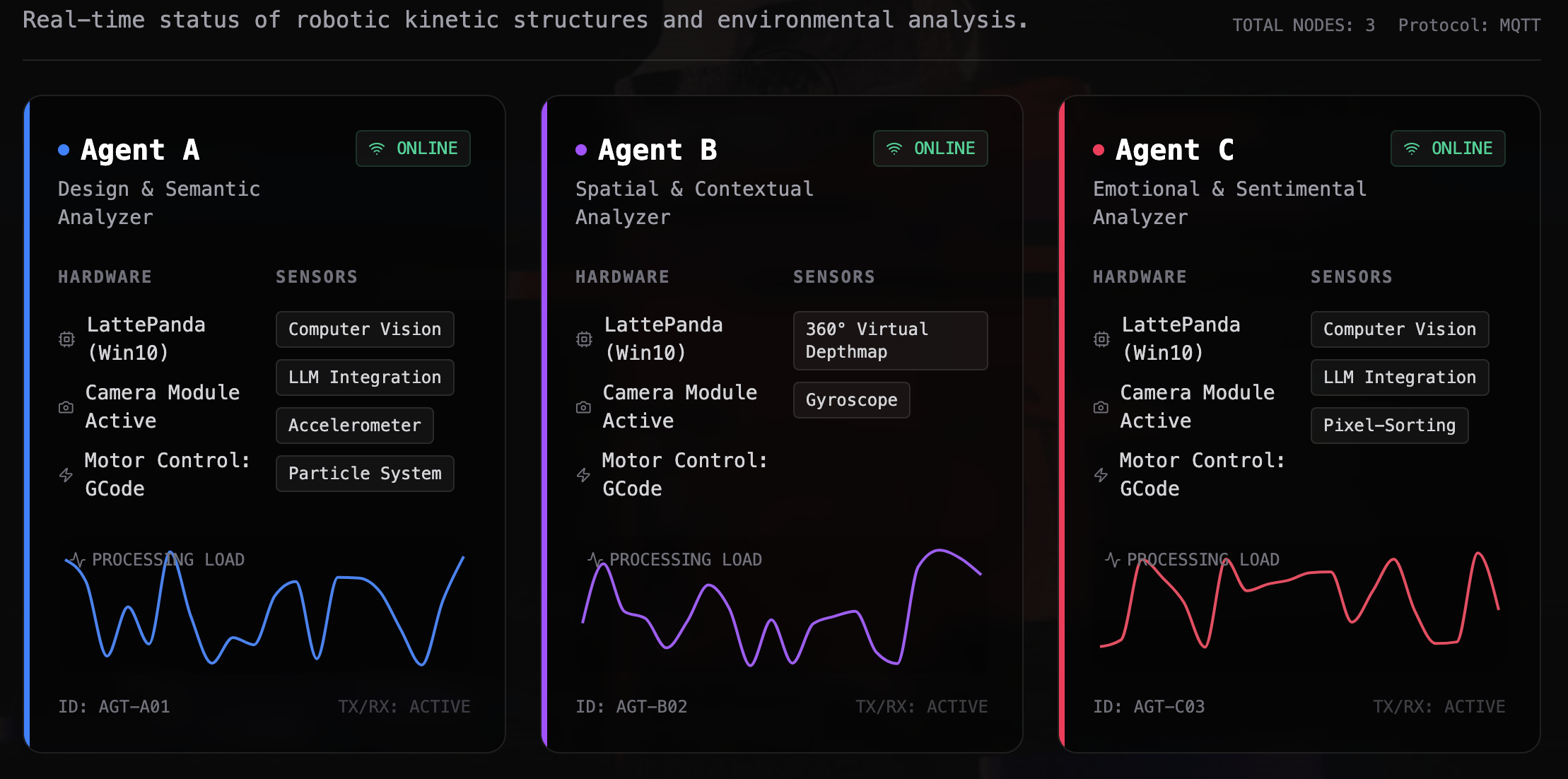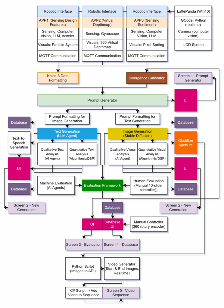 Koios-3 consists of three robotic interfaces, each featuring a mobile phone with a custom app that scans distinct properties of both physical and virtual environments. The first device, equipped with a computer vision (CV) system and a Large Language Model (LLM), focuses on identifying design features of the space—such as colors, textures, patterns, objects, and other observable physical elements. The second device, also using CV and LLM, targets emotional and sentimental aspects of the environment, aiming to recognize moods, atmospheres, social interactions, and affective states of people present. The third interface displays an endless depthmap that wraps on a virtual 360 degrees space. The rotation of the device triggers the phone to adjust its angle and position, revealing views of the depthmap that always varying spatial depth and complexity. The data that is gathered from these three interfaces – encompassing design characteristics, emotional cues, and compositional dimensionality – is transmitted to the prompt generator that integrates these inputs into instructions for producing the textual and visual narratives of the main engine.