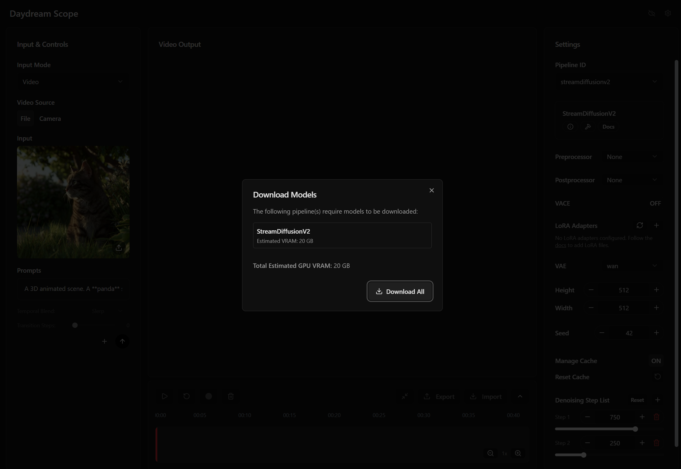 - Setup a Runpod instance using these instructions: https://docs.daydream.live/scope/getting-started/quickstart#cloud-runpod. After the instance is deployed, click on the HTTP Services > 8000 port link. Copy the URL and use it in Unity (step 3). Finally, make sure that the models are downloaded (streamdiffusion has better FPS performance).